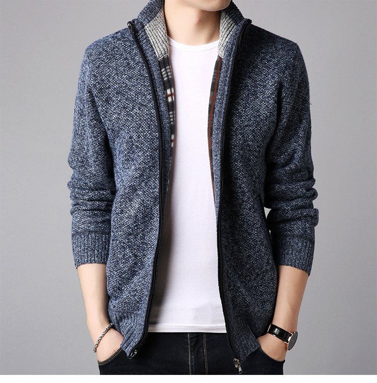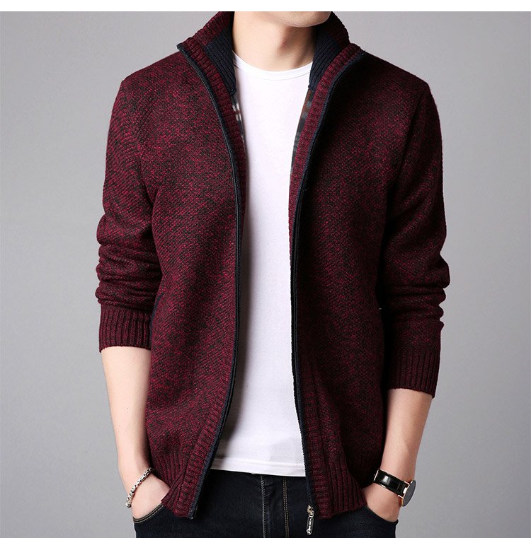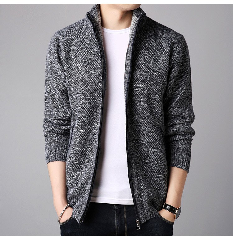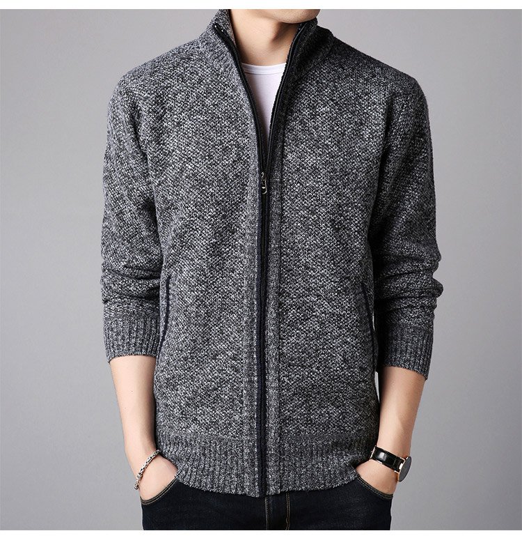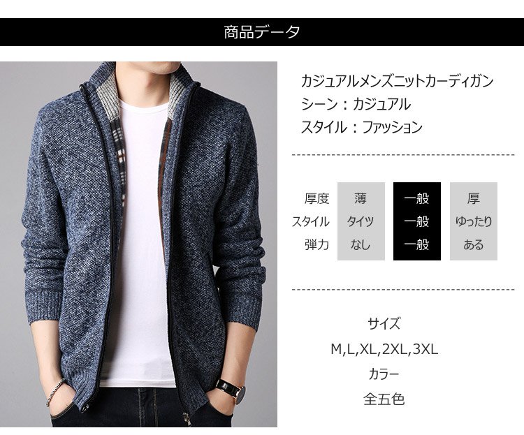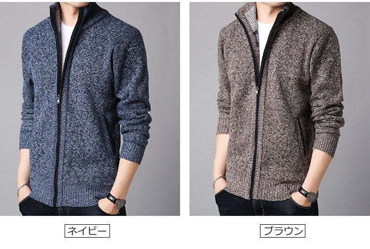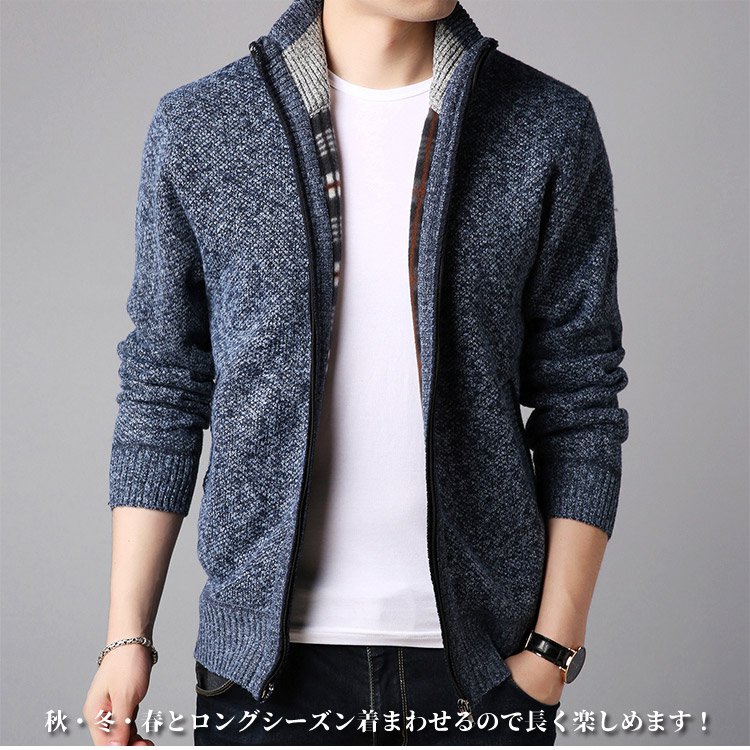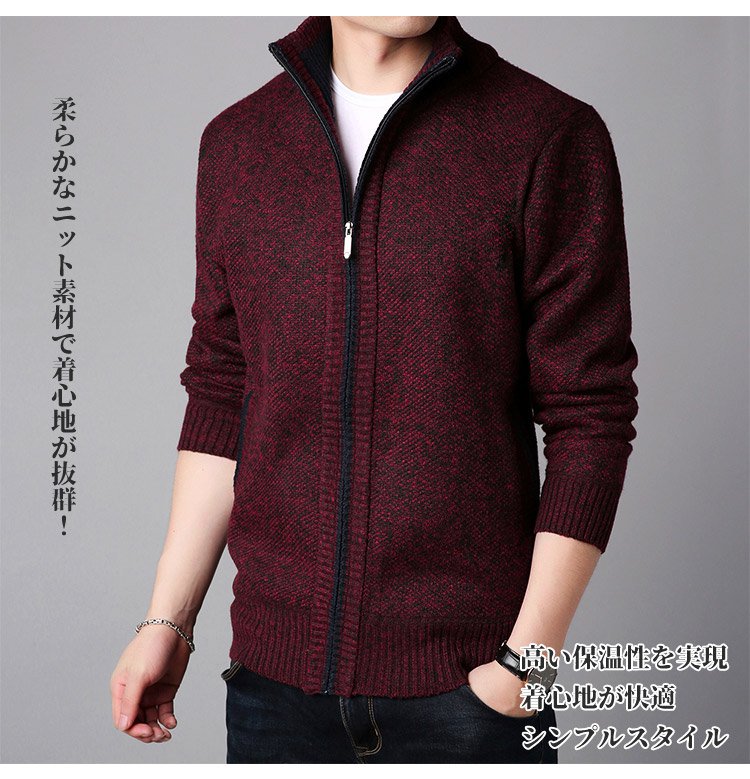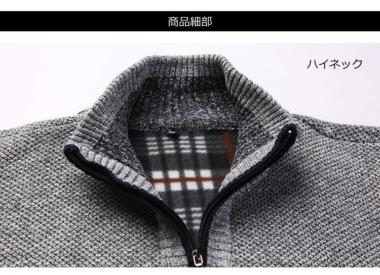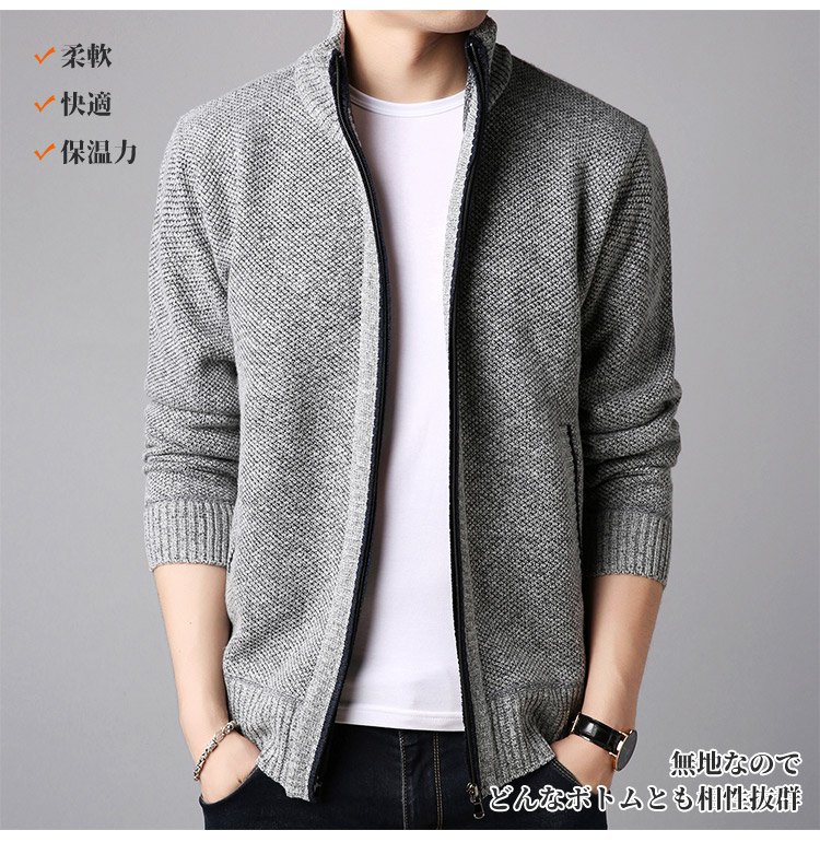 ジップアップ、ハイネック 暖かいメンズニットカーディガン 柔らかくて着心地も良い 無地なのでどんなボトムとも相性抜群